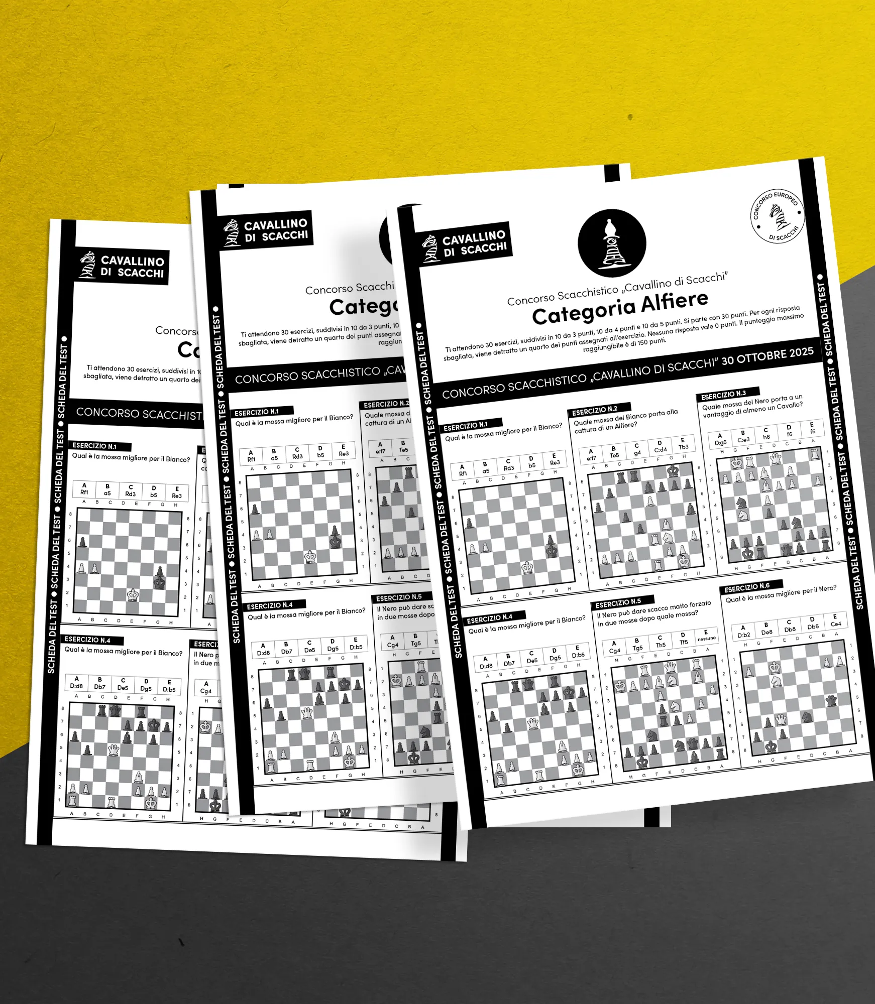 Sulle schede dei problemi ci sono 30 compiti di scacchi di varia difficoltà, adattati all'età e al livello del partecipante. Un corriere consegnerà queste schede alla scuola qualche giorno prima della scadenza.